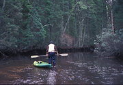 We crossed Harrison Lake in the rain. Rested on the beach by the flood gate with hot instant WAWA cappuccino (I really needed that). Put back in below the dam in dusky light, and tried to find our way to camp. In the twilight, the buried branches and sinks made mince meat of my boat, and I was ‘sucked under’ at least three more times, the last time in a strained that took my hat, Maryann’s hat and my 85mm Nikons finder (right out of my pocket) as a toll for riding this byway. Thank God for Vern. That guy can maneuver, and like a true Scouter, always was there to lend a hand! But the worst was yet to come. In the dark, the swarthy couple of newbie kayakers, our friendly leaders Mike and Janet, got picked off by this nasty little tree that just shook them out of their boat! Janet was treed! Mike (who really didn’t want to hear he might get wet in a kayak) had been baptized by the river. And the kayak had decided to find its own way home! Well, the thought of walking in the Jersey Devil’s Pine Barrens at night with but one flashlight any number of unknown miles (I also forgot my topo) didn’t appeal to me. With Janet and Mike safely tucked in for the moment (not that I had a chance of any buoyancy in my craft) I shuttled off to locate the errant boat. Unfortunately, when I found it I went swimming again. Now the last dump had me remembering my dive drills when in an “overhead” environment and the ‘tangled grass” experience. I must say I didn’t think I had an ounce of reserve after getting my waist and knees caught in the last tree. But being dumped here, with no bank in sight, and the river actually running through a strainer in another downed tree just made me question why I had come at all! I climbed up in the tree, and plain made the decision this river was NOT going to get the best of me.