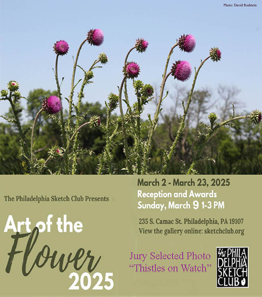 Take note - David's image "Thistles on Watch" was chosen to be exhibited in The Philadelphia Sketch Club's Art of the Flower 2025 Exhibit at 235 S. Camac St., Philadelphia, PA 19107.