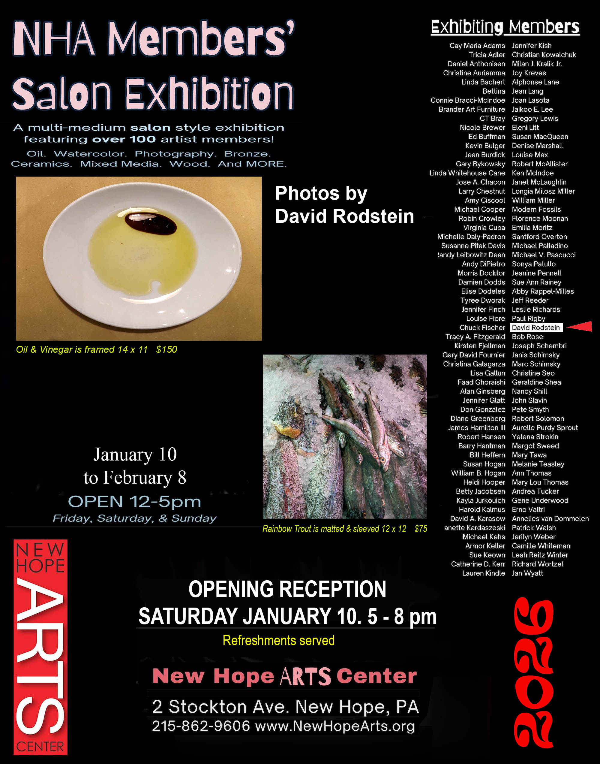 New Hope Arts Center on 2 Stockton Ave in New Hope is hosting a Member's Salon Exhibition from January 10th to February 8th. There is an opening reception Sat Jan 10, 5-8PM. Member David Rodstein and former member Sue Ann Rainey are among the 100+ members exhibiting.